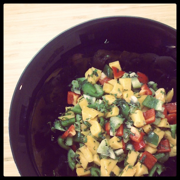 Favorite salad của hai vợ chồng. Công thức ban đầu rất đơn giản: kiwi, xoài ngọt, ớt Đà Lạt, nước chanh. Xong. Thêm một nhúm rau bạc hà thái chỉ nữa cho thơm. Tôi không ăn được ớt Đà Lạt nhưng hai loại quả còn lại thì khỏi phải nói, cái nước còn lại sau khi món salad đã hết cũng rất ngon.