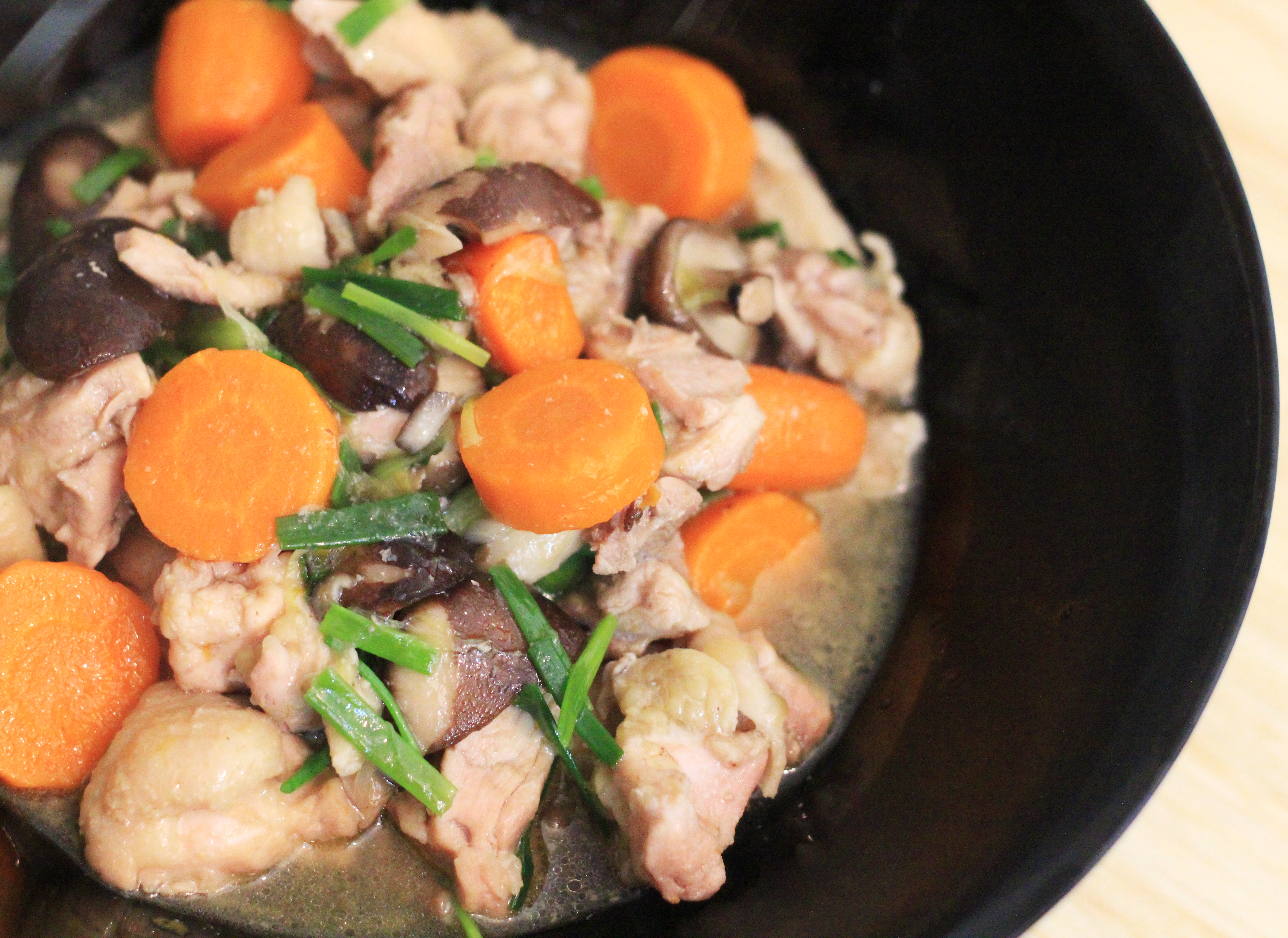 . Nấm đông cô rửa sạch cắt đôi. Cà rốt cắt khoanh dầy 2cm. Thái thịt gà thành miếng khoảng 3cm.