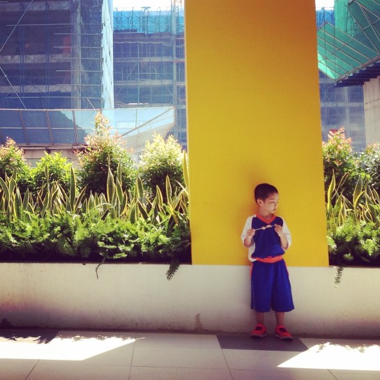 Và có nhiều lúc hơn, con thích tách ra một mình. Như trong tấm ảnh đầy nắng ở đây. Đấy là những lúc con hơi trầm tư suy nghĩ gì đó. Không biết là những toa tàu màu sắc nào đang nối đuôi nhau trong đầu óc bé nhỏ của con. Rồi sau đó con lại chạy đi chơi ồn ào vui vẻ như cũ.