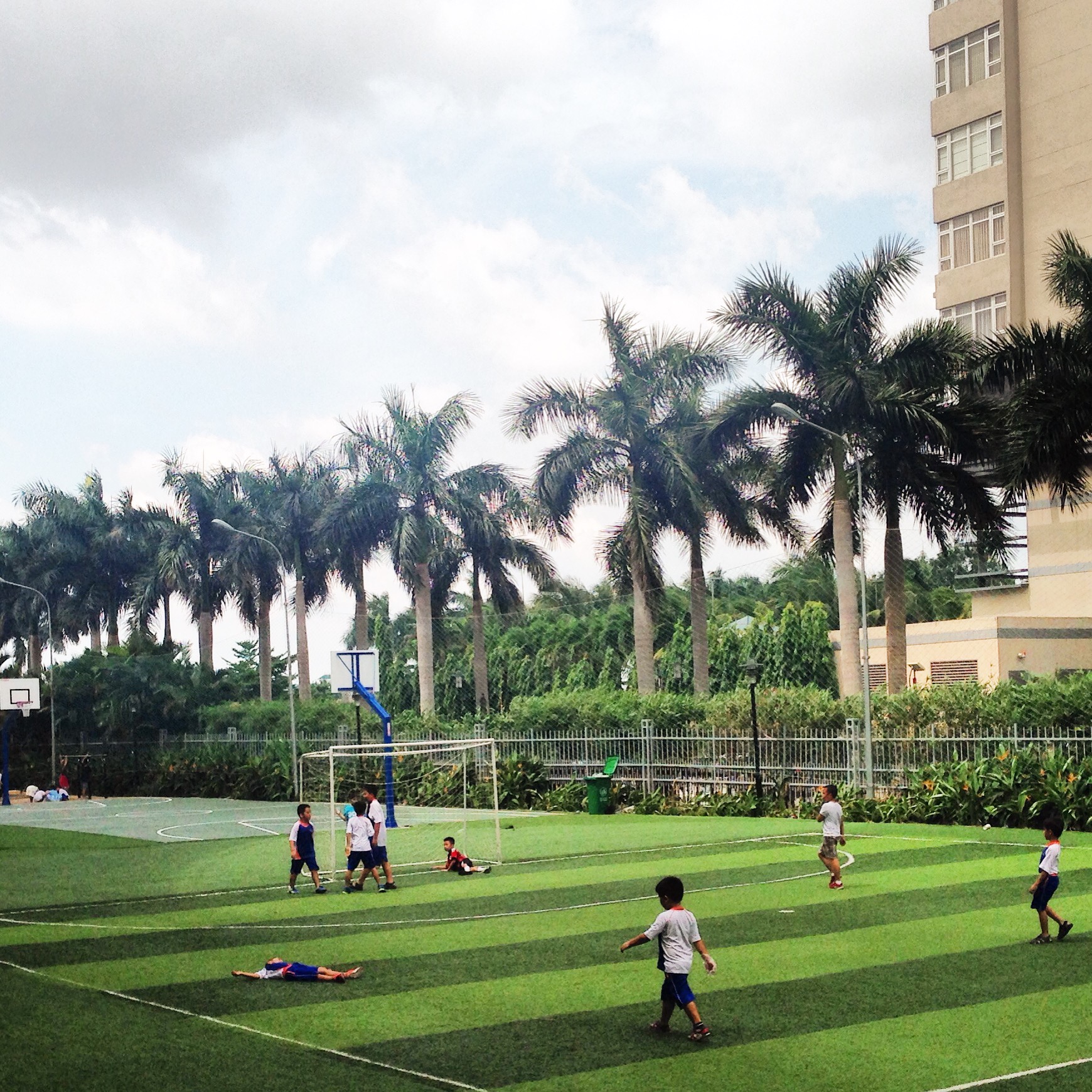 Mùa hè này, lần đầu tiên mẹ đứng trên bậc bê tông của khán đài và nhìn con chạy chơi trên sân bóng. Đó là một hình ảnh rất mới mẻ, để mẹ làm quen với thế giới của con ở trường tiểu học. Con thích đá bóng, tập sút, tập chạy bắt bóng, vừa lấy tay đập bóng vừa di chuyển. Ngoài sân có đủ các level. Lũ nhóc tập toẹ chơi như con. Một cậu bạn cùng lớp học hè với con mà dáng đã rất chuyên nghiệp, đến cú sút bóng quá mạnh bị ngã ra sau trông cũng pro. Mấy anh lớn hẳn thì không thèm để mắt đến các chú bé loi choi chạy xung quanh. Có lúc các con đang chạy theo bóng thì lại rẽ qua đuổi theo một cái túi nilon đang bay và la hét chí choé. Trong ảnh thì anh bạn là cái cậu bé đang nằm dang chân dang tay giữa bãi cỏ kia. Cũng vào mùa hè lên Sáu này, con đi dã ngoại qua đêm với trường. Con về nhà với cái mặt đen nhẻm cháy nắng, một ba lô đầy quần áo bẩn, không bị mất đồ dùng nào, và đủ chuyện kể suốt một buổi tối.