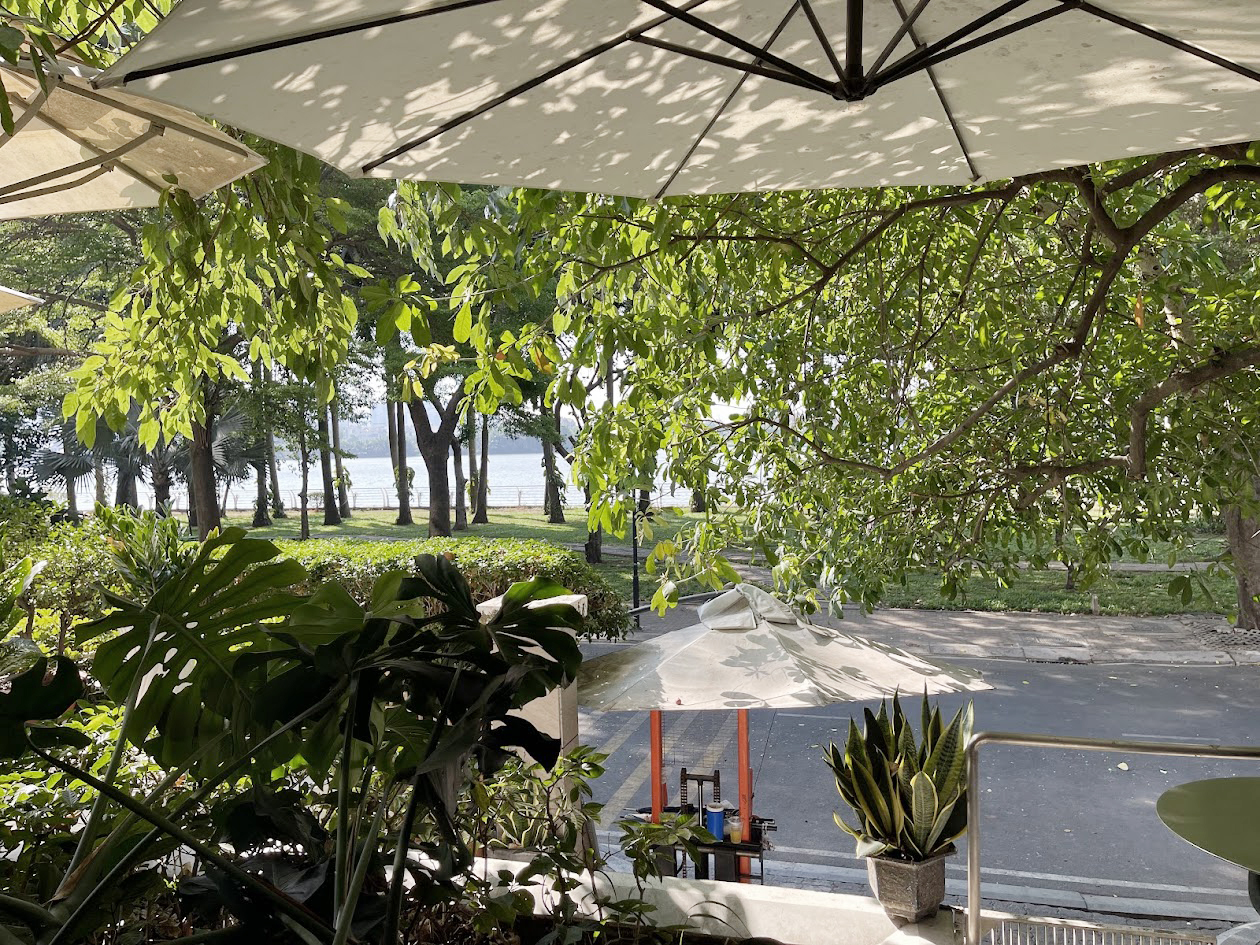 Trời nắng đẹp, nắng xuyên qua nhiều tán cây chiếu xuống xung quanh quán.