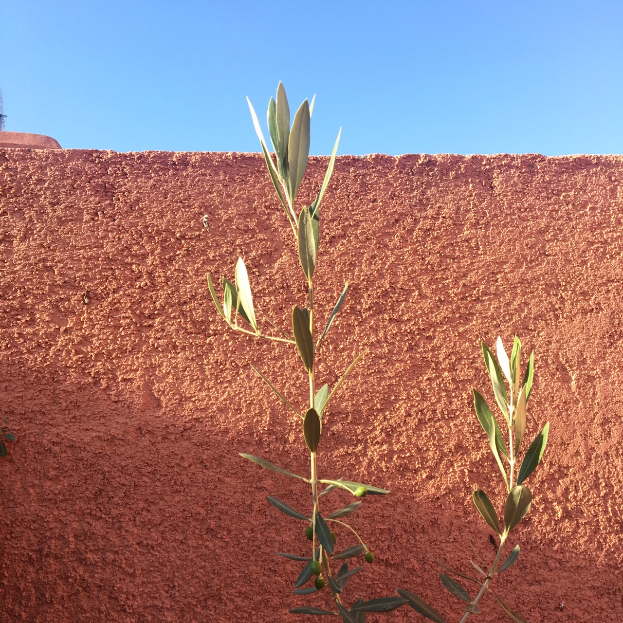 7h sáng, đói quá nên bọn tôi vòng về khách sạn dù biết 8h mới có đồ ăn sáng. Lúc đầu định ăn sáng trên sân thượng, nhưng tiếc là cái riad này ko đầu tư chút nào cho sân thượng. Chỉ có cái cây olive xinh xinh này.