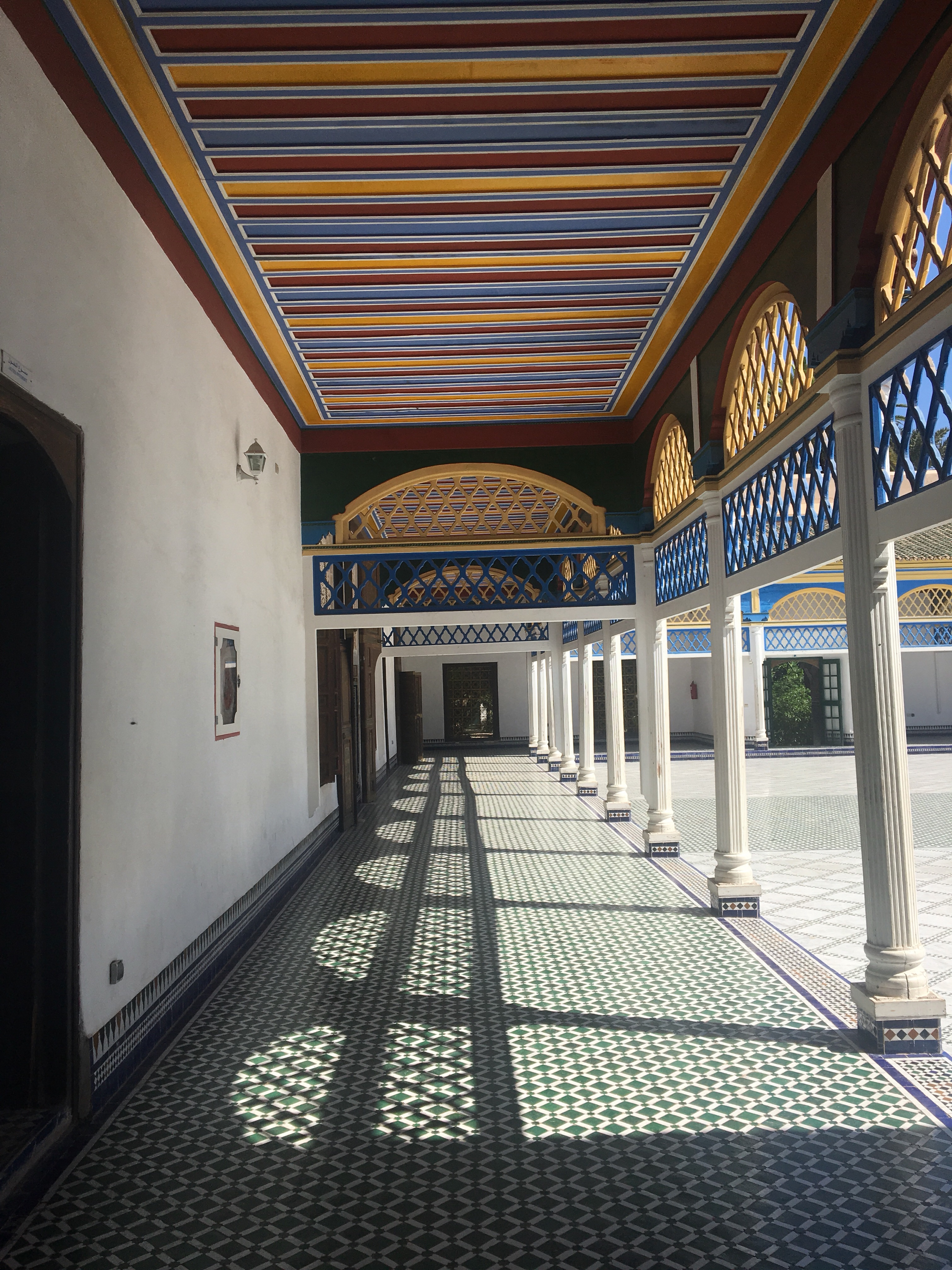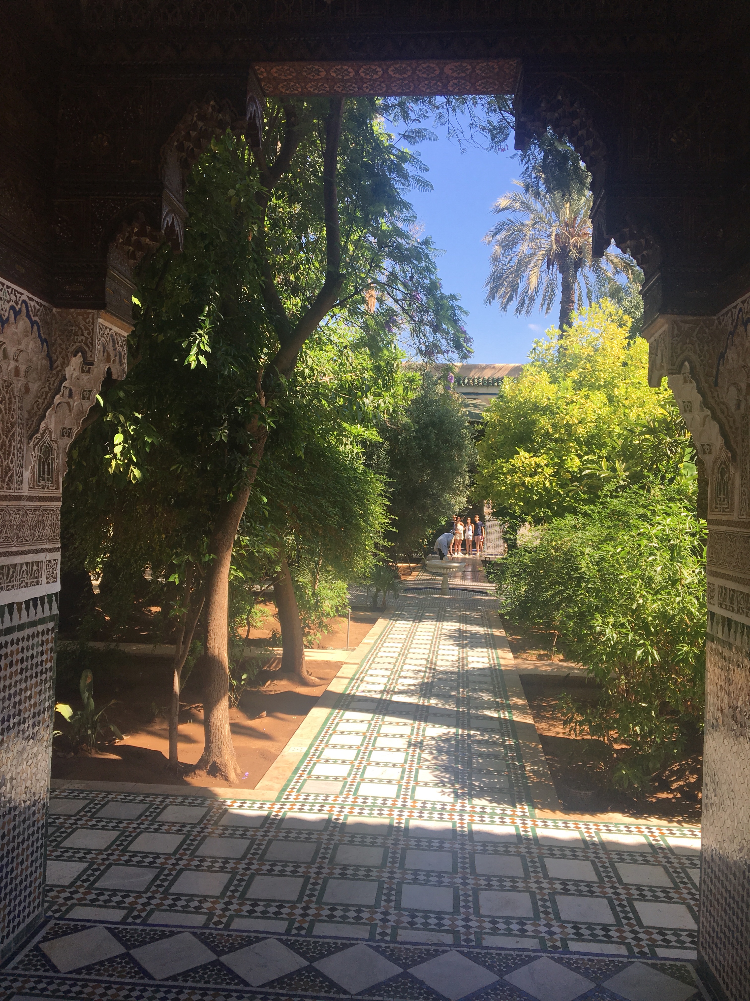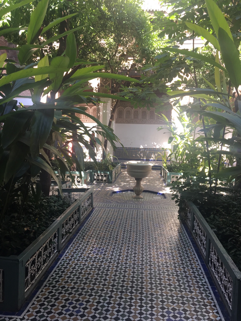 Chỗ bọn tôi ở ngay gần Medina Square, từ quảng trường đó dẫn tới nhiều địa điểm tham quan. Bọn tôi chọn Palais de Bahia, cách nhà khoảng 20 phút đi bộ. Nhưng phải đi 1 vòng mới tìm thấy lối vào. Bước vào trong thấy không khí thơm mát mùi hương thảo. Cây hương thảo được trồng một cách hào phóng thành hàng rào bên đường, cành lá rất khoẻ, mùi thơm mạnh mẽ hơn hương thảo tôi gặp ở VN. Hoa hồng ở đây cũng vươn rất cao, cánh hoa hơi hoang dại chứ ko điệu như hoa hồng Úc.