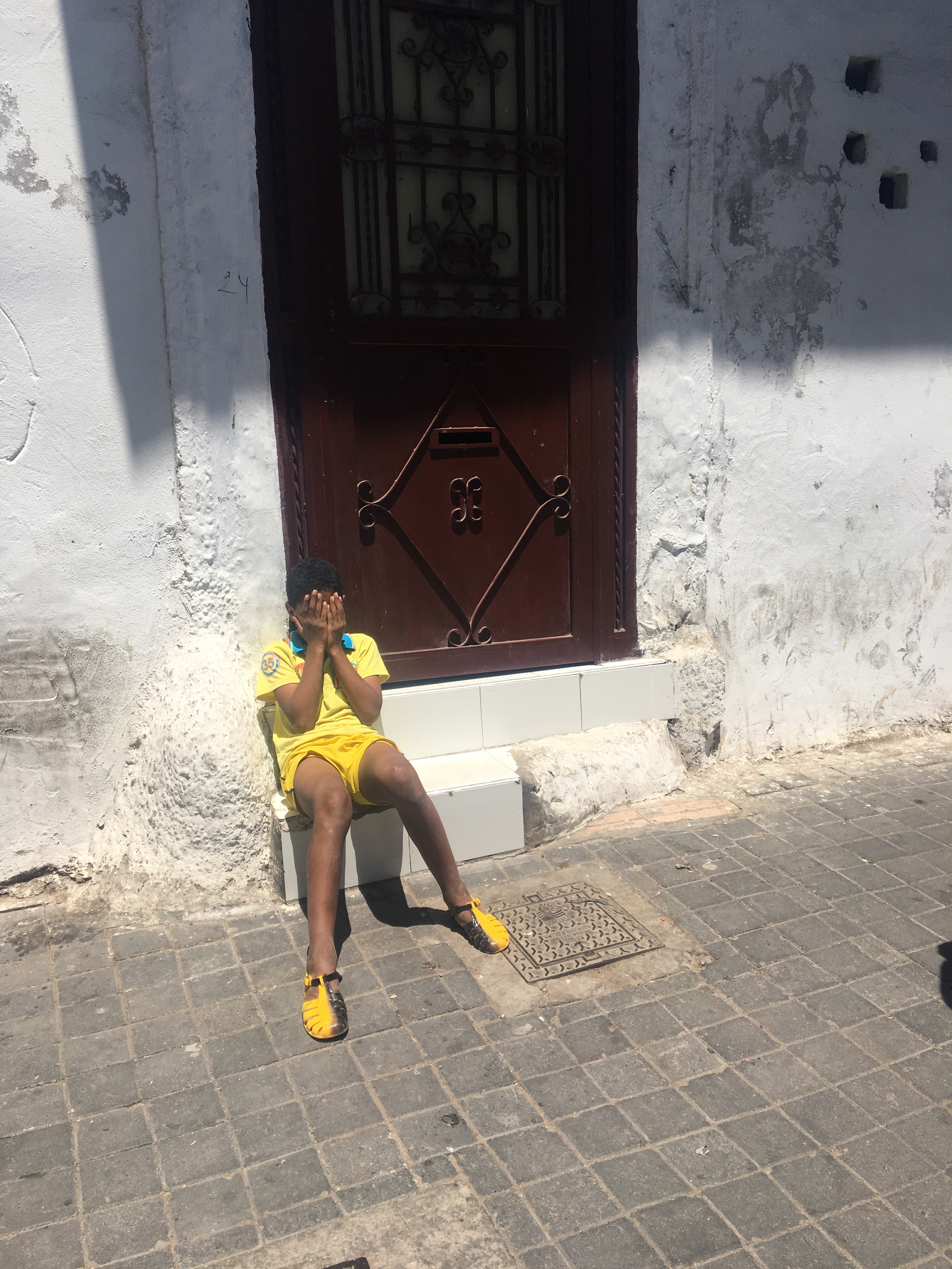 Một cậu bé ngồi chơi trước thềm. Cậu cứ che mắt lại rất lâu, ko biết đang chơi với ai.
