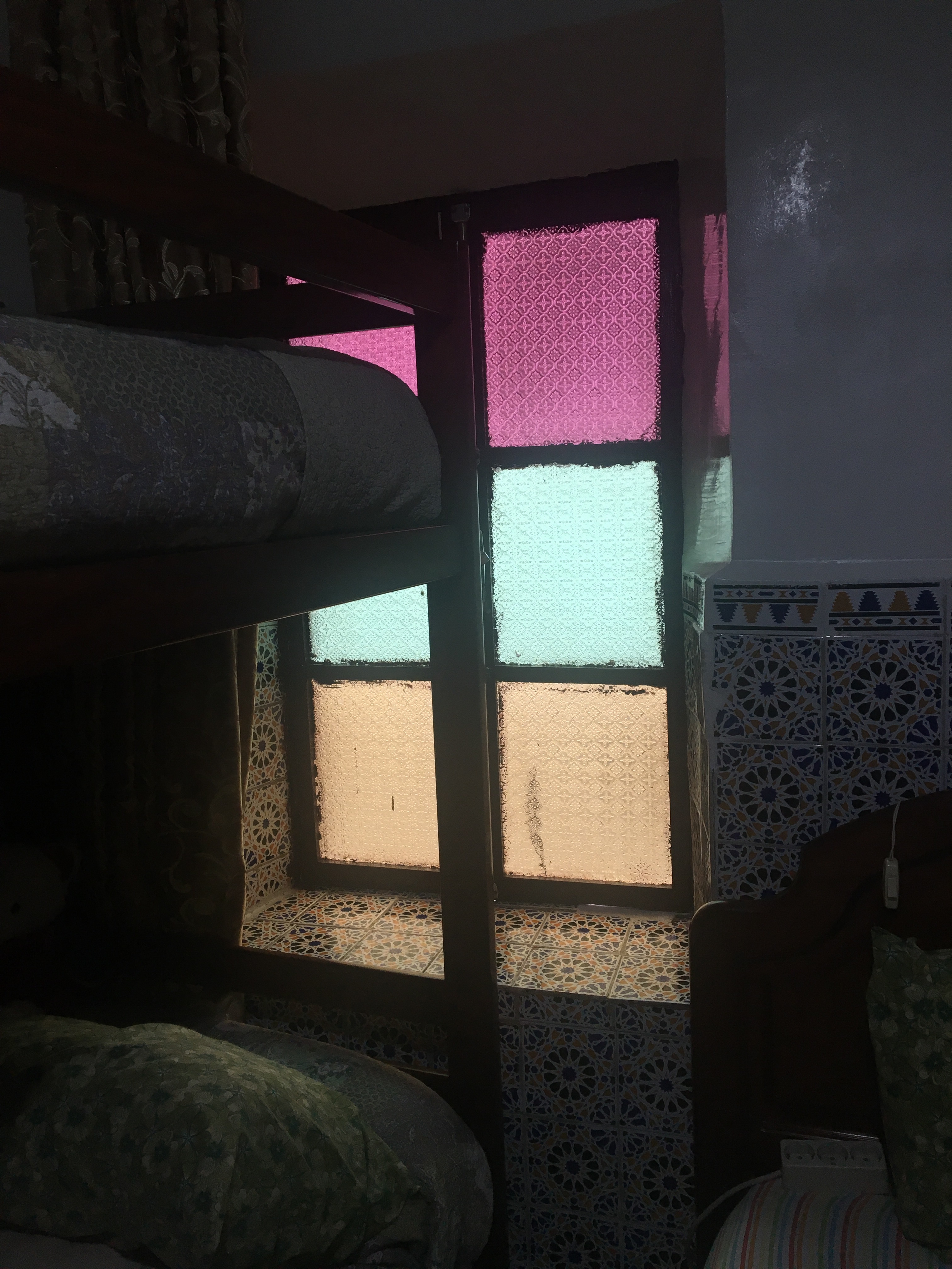 Đây là căn nhà bọn tôi thuê, nằm cách Casa Port khoảng 7 phút đi bộ. Cửa sổ phòng bọn tôi là ô kính màu trên tầng 2, hoa văn y hệt cửa kính nhà bố mẹ tôi hồi xưa, chỉ là thêm màu thôi.