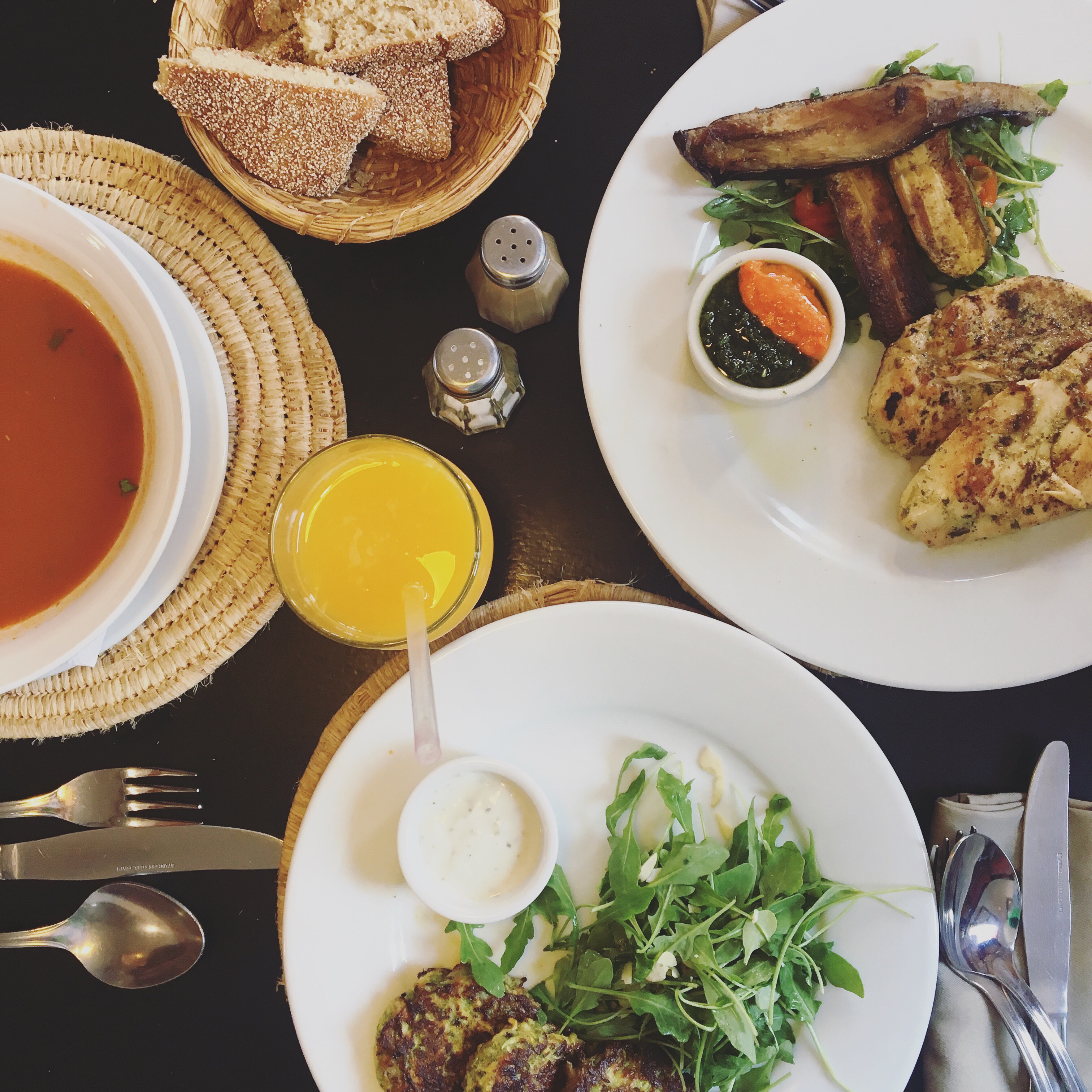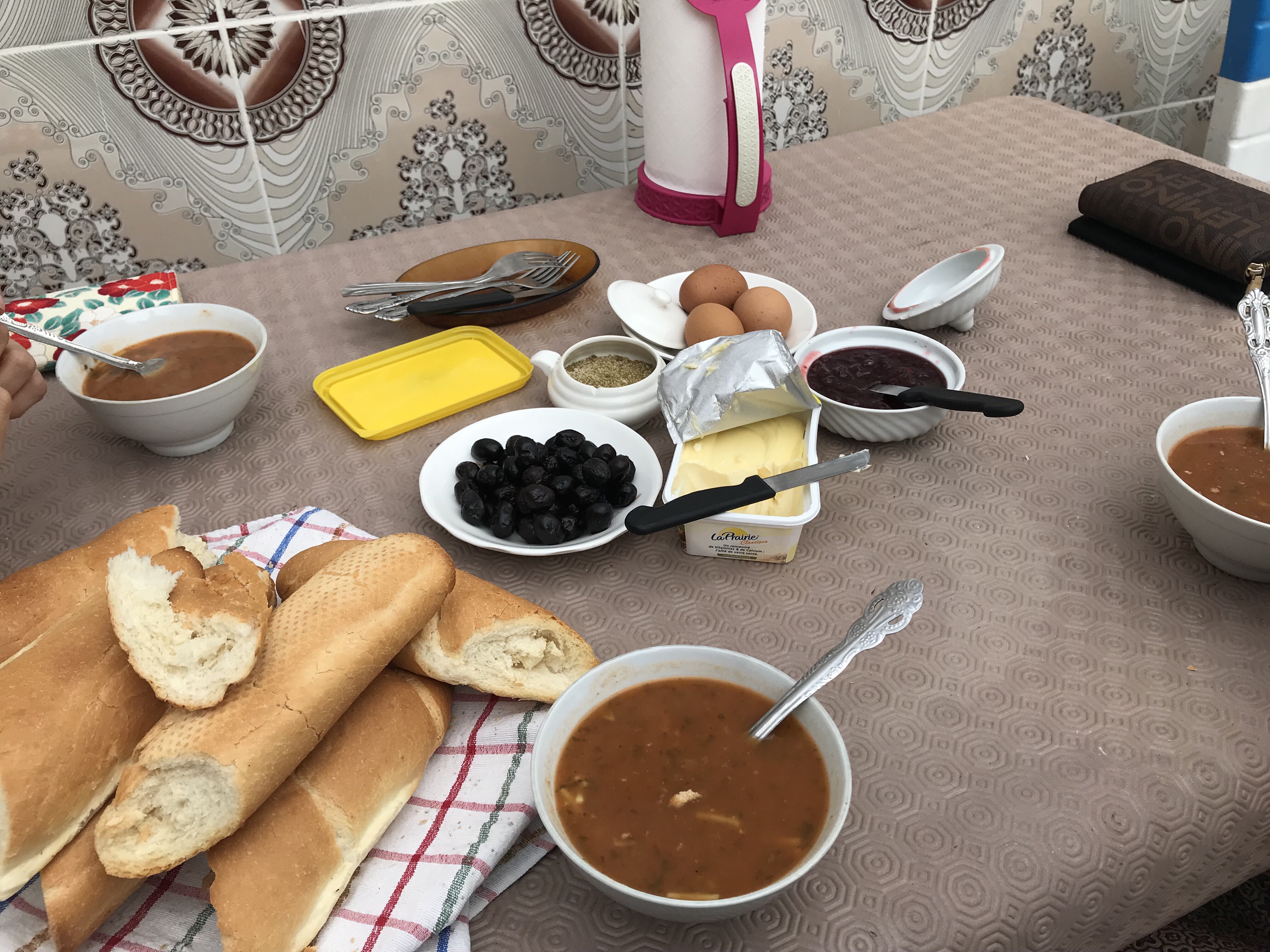Gặp họ bọn tôi mới nhận được một tin “sét đánh”, đang là tháng Ramadan nên họ sẽ ko ăn gì cho đến cuối ngày. Không nhà hàng nào mở cửa trừ Mc Donald’s. Ba con mèo đang đói meo, mệt lử sau chuyến bay dài, nghe tin này mà muốn xỉu. Nhưng may mắn chủ nhà vẫn có thể nấu ăn cho bọn tôi. Trong chốc lát họ đã dọn ra bánh mỳ baguette (thơm và giòn ngoài sức tưởng tượng), mứt dâu, bơ đóng hộp, olive, trứng luộc chấm muối trộn bột thì là, và Moroccan soup ngon tuyệt. Món soup, chắc là chay, gồm các loại hạt, ít sợi mỳ, chua và thơm dịu dịu. Tuyệt nhất là bọn tôi được ngồi ăn trên cái sân thượng truyền thống, dưới ánh nắng Maroc 🙂