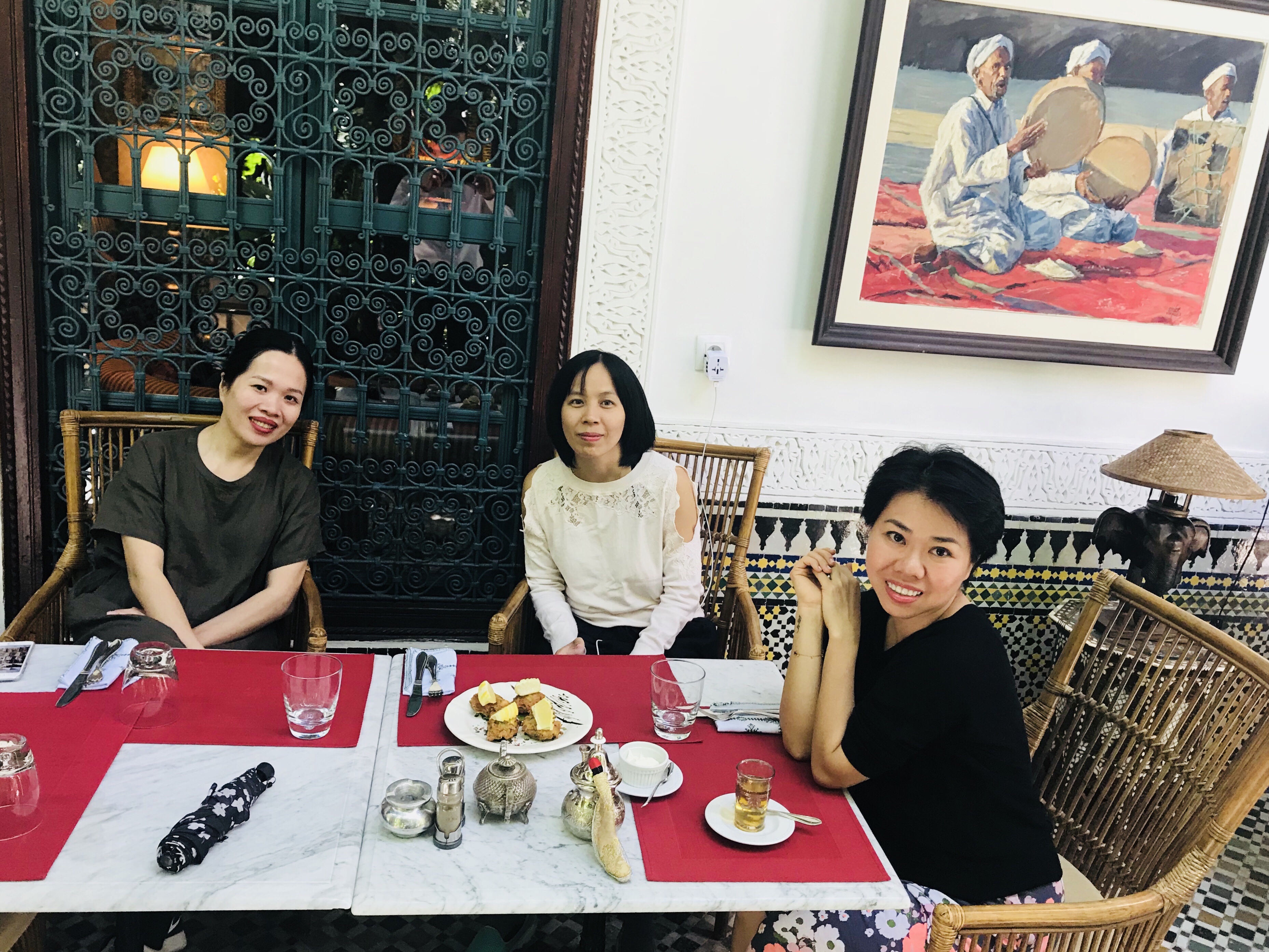Kết thúc Palais de Bahia, bọn tôi đi bộ ra Palais El Badii. Nhưng lần này ko được suôn sẻ, cái Google map làm bọn tôi đi qua đi lại vòng vèo mãi, phải hỏi đường mới tìm được đến nơi, thì cung điện đóng cửa. Nắng chang chang nên bọn tôi quyết định đến quán ăn ngồi nghỉ. Quán có khu vườn đẹp mát rượi, thật sự là bước vào quên hết mệt nhọc (sáng nay đi vậy mà cũng tới hơn 9 cây số).